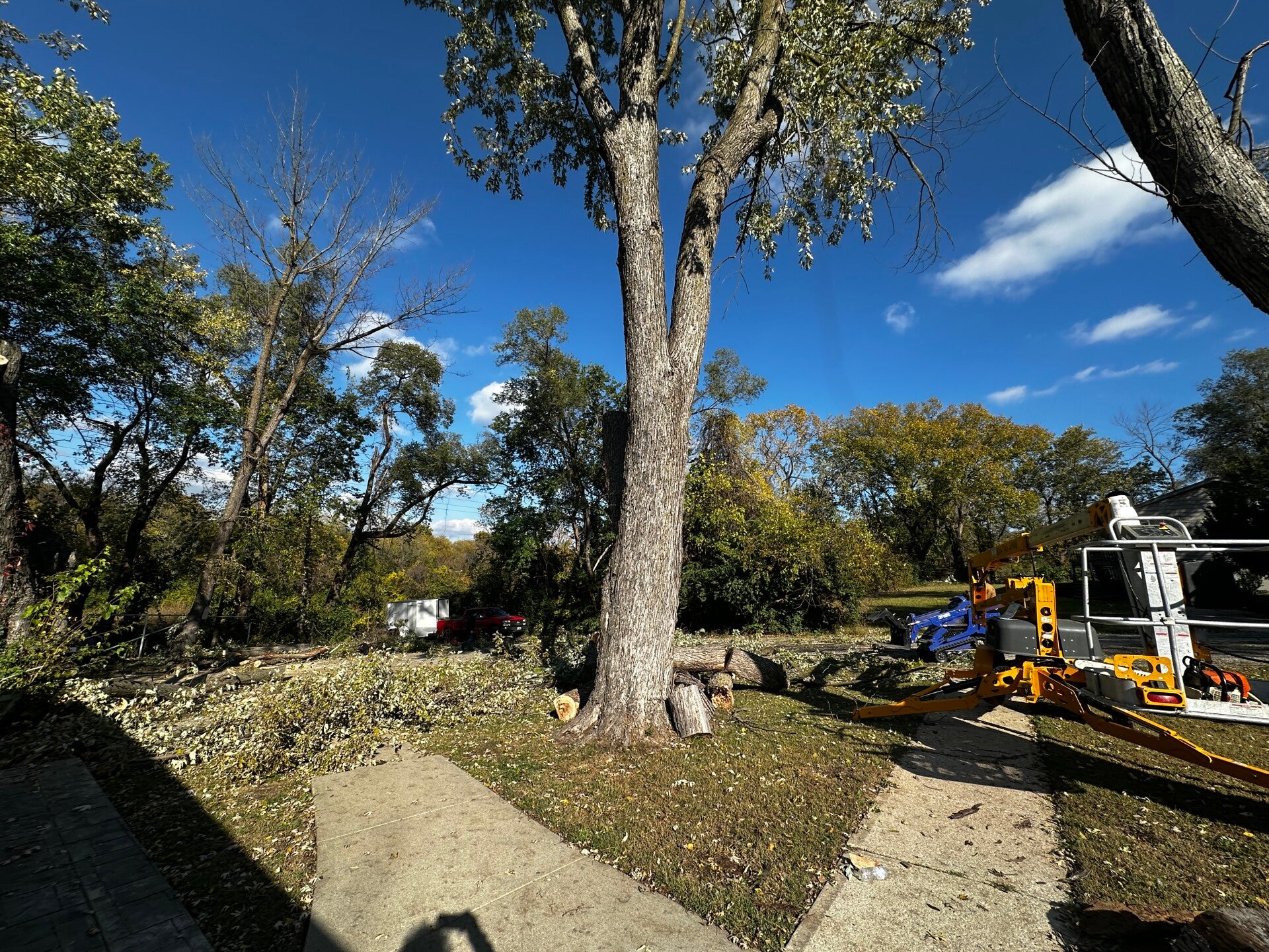 Video shows Zack owner and lead operator in a bucket lift dropping a 20 foot plus tree top hanging over a fence and house safely into the driveway below.